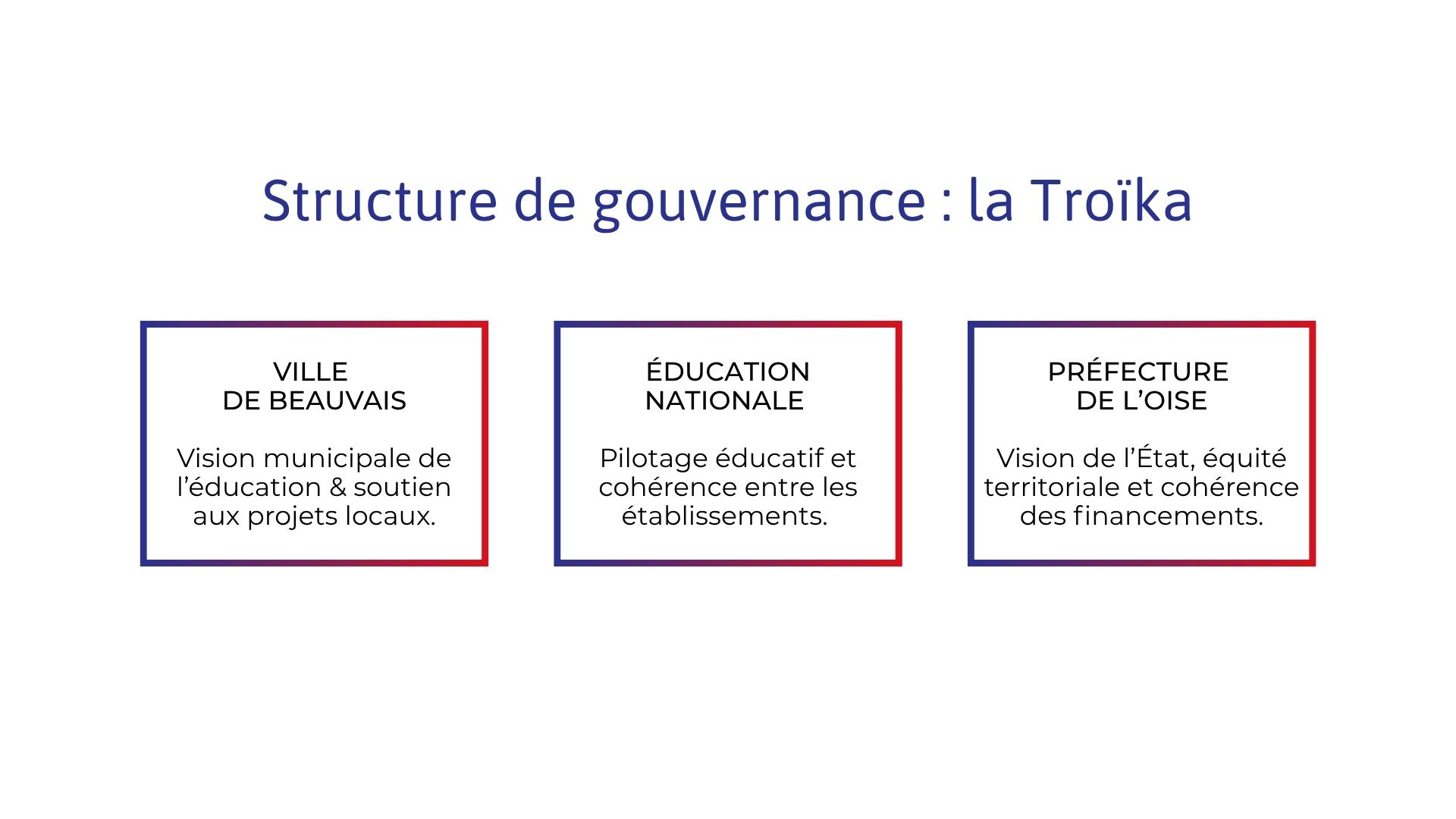 Ensemble, ces trois têtes de file définissent les orientations prioritaires, valident les projets, arbitrent les financements et garantissent la cohérence globale de la démarche. La Troïka incarne la gouvernance stratégique de la Cité éducative, dans un esprit de coresponsabilité et d’alliance éducative. La Troïka de Beauvais est représentée par les 3 instances :